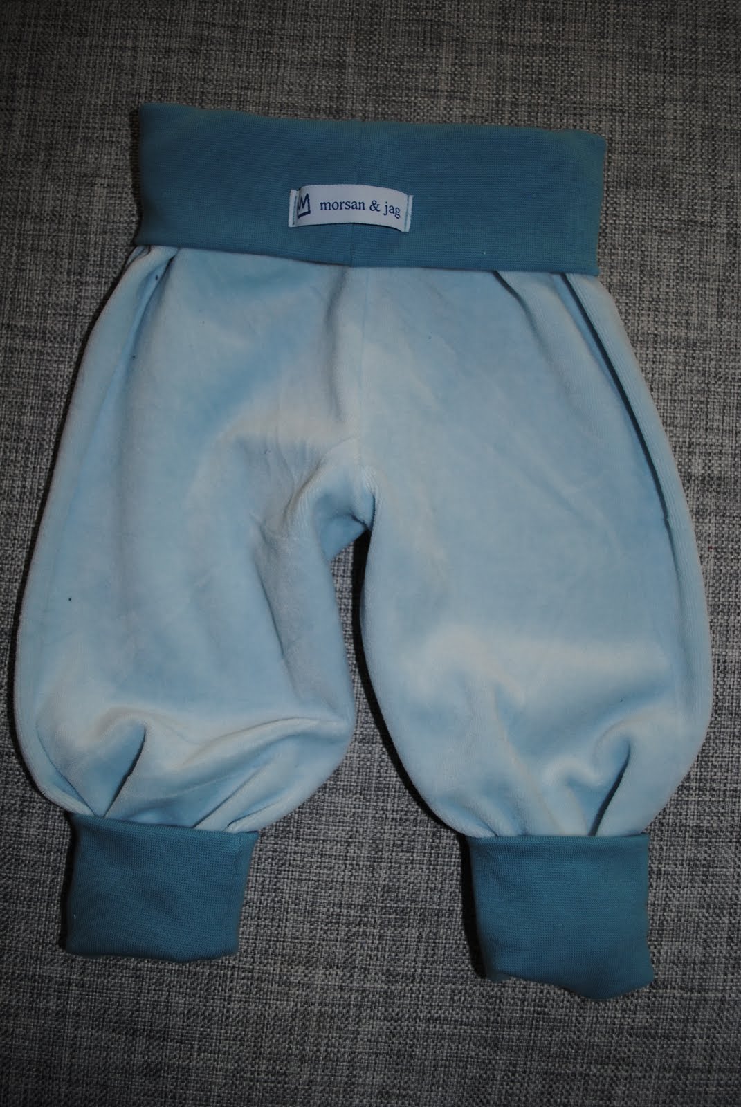 De här mysbrallorna är rymliga, sköna och lekvänliga! Ljusblå velour med blågrön mudd.